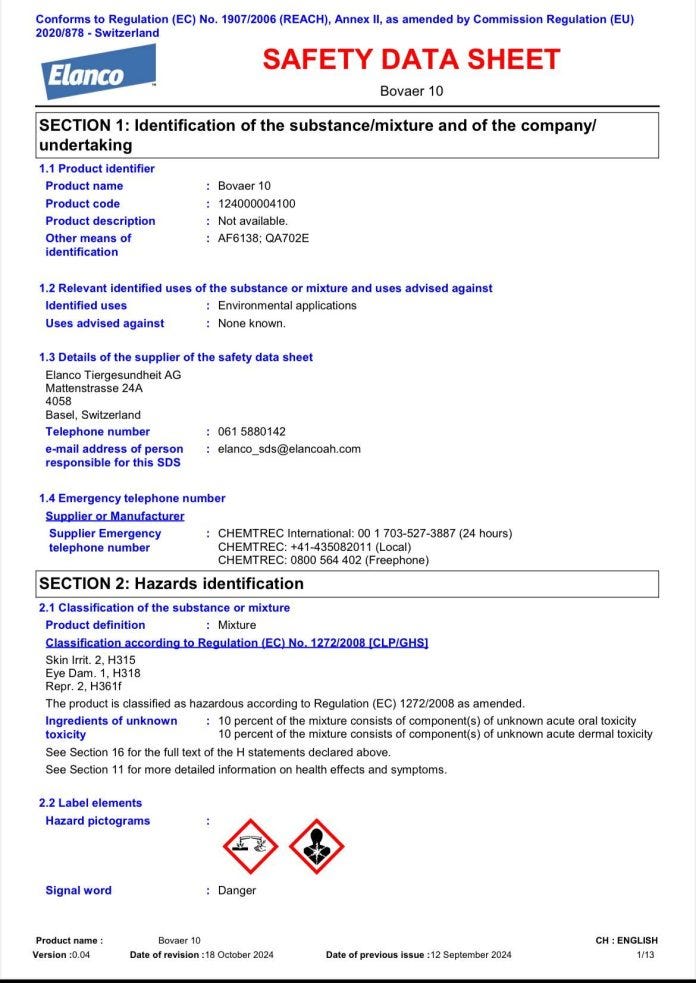Her er hva Elanco, produsenten selv, skriver i sitt offisielle Safety Data Sheet: