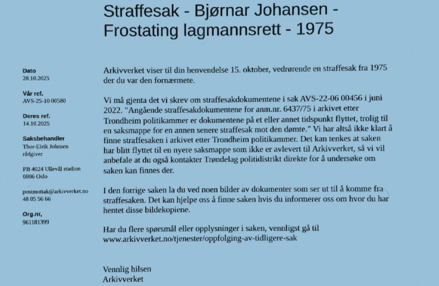 Selv etter at han i 2020 formelt ba om innsyn i sin egen sak, ble begjæringen ikke journalført og senere makulert. Politiet har siden gitt motstridende forklaringer om hvor saken befinner seg, hvem som har den, og hva som eksisterer. Dette betyr i praksis at grunnlaget for rettslig etterprøving har vært blokkert.